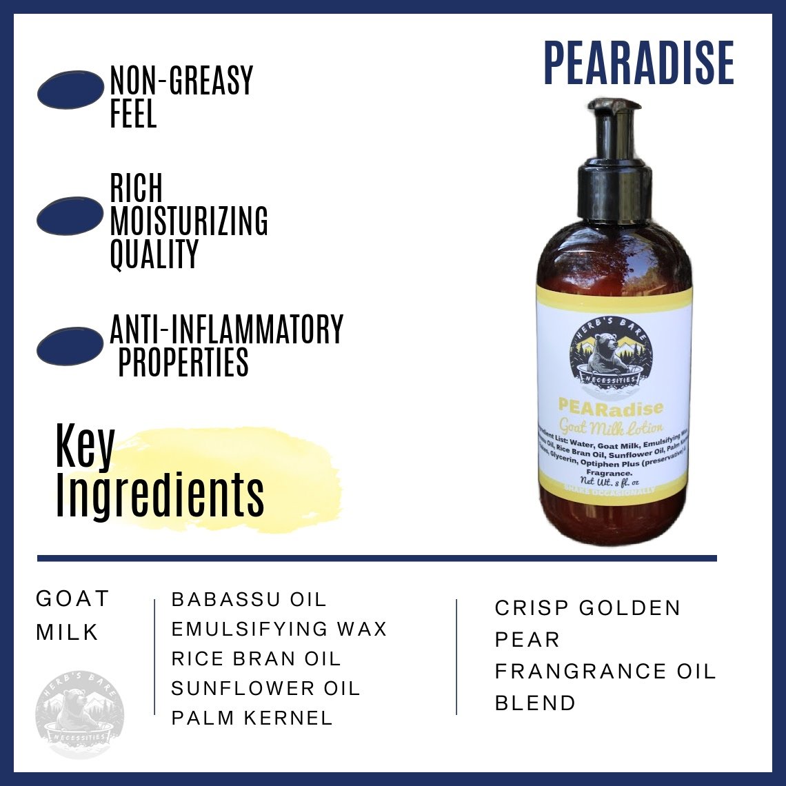 Full Ingredient List for Lotion: Water, Goat Milk, Emulsifying Wax, Babassu Oil, Rice Bran Oil, Sunflower Oil, Palm Kernel Flakes, Glycerin, Optiphen Plus (preservative), and Natural Fragrance.