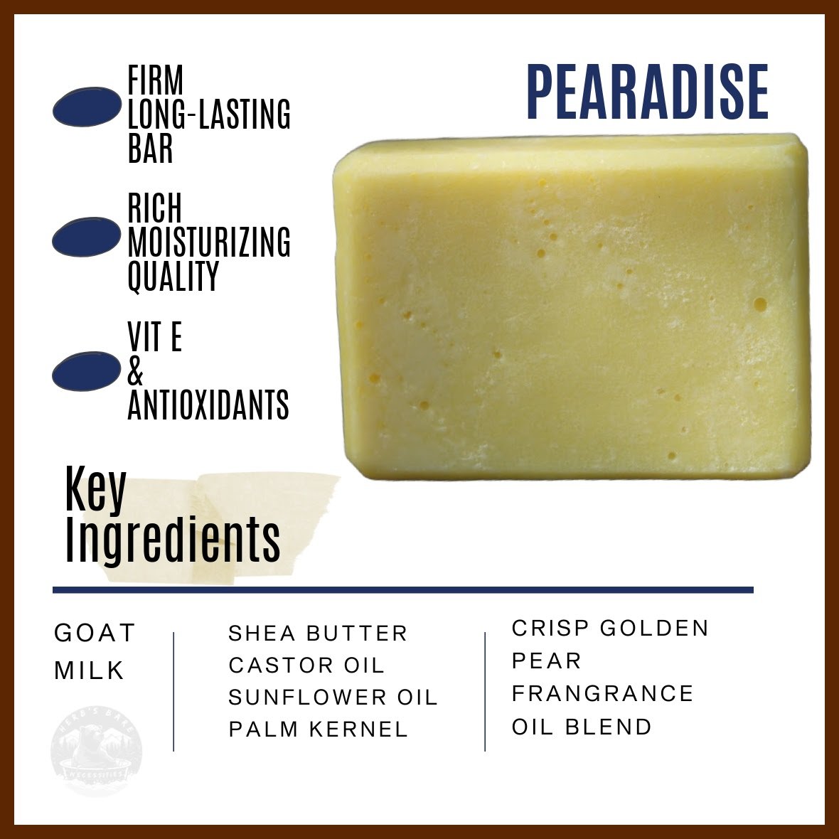 Full Ingredient List for Soap: Saponified Oils/Butters of (Palm Kernel, Sunflower, Castor & Shea Butter), Goat Milk, Lye, Sodium Lactate, Glycerin and Fragrance.